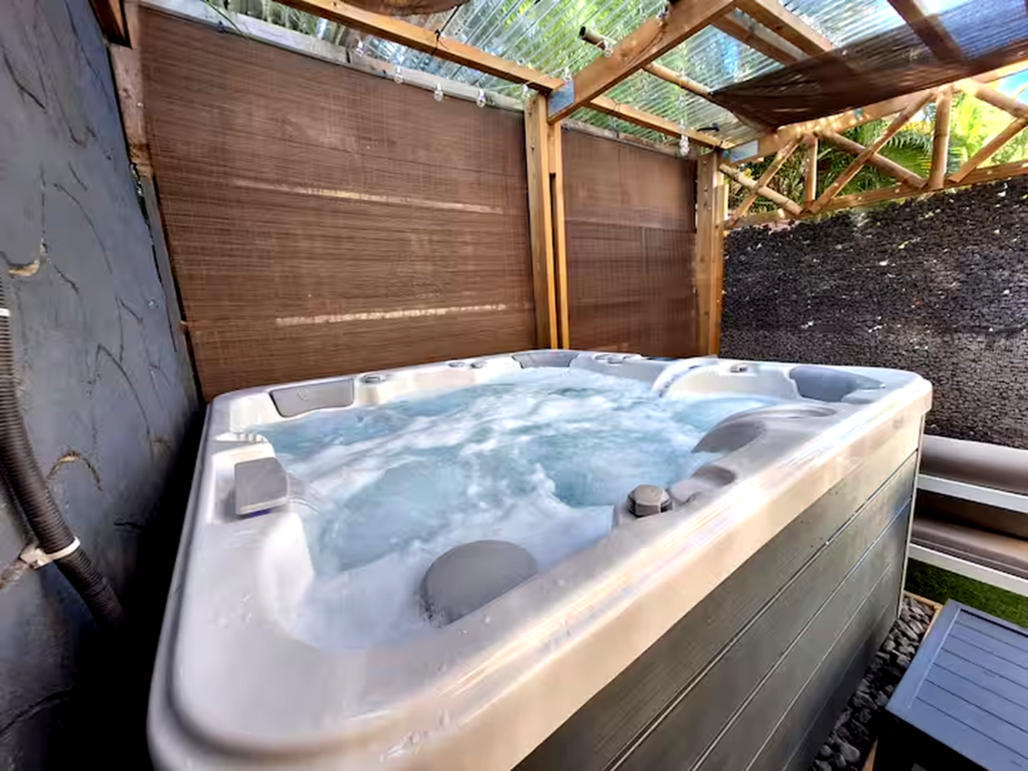 Jacuzzi privatif extérieur avec vue dégagée. Idéal pour se relaxer après vos aventures. Terrasse aménagée avec mobilier de jardin pour profiter du climat tropical.